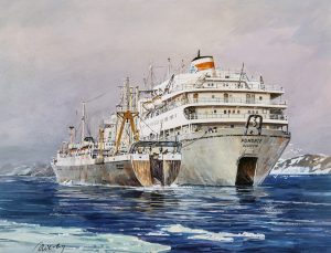 Polski trawler przetwórnia „Feniks” przy burcie statku bazy „Pomorze”